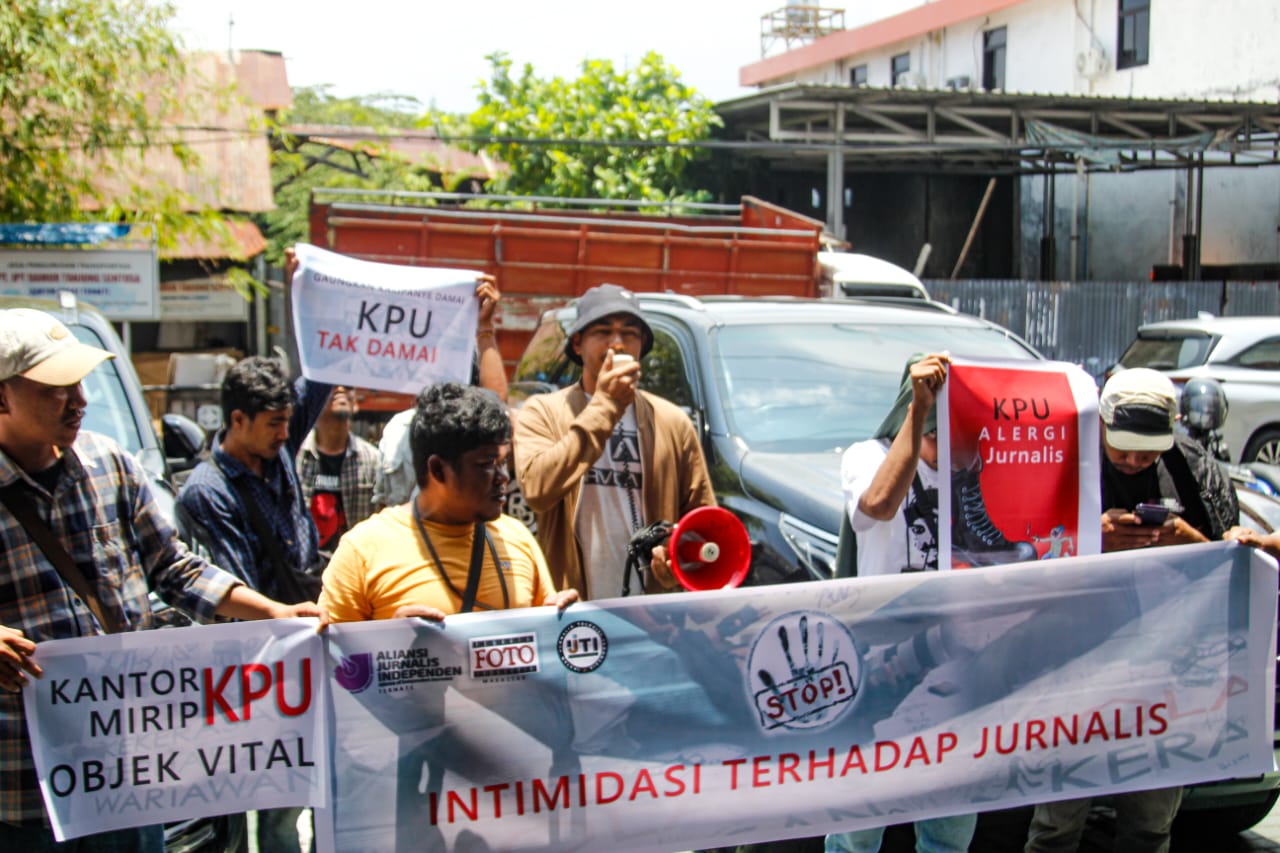 Aliansi Jurnalis Independen (AJI) Ternate, Pewarta Foto Indonesia (PFI), dan Ikatan Jurnalis Televisi Indonesia (IJTI), bersama para wartawan di Ternate lainnya menggelar aksi di depan kantor KPU Maluku Utara, Kamis, 26 September 2024.