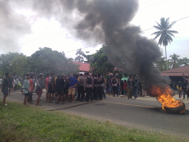 Aliansi Masyarakat Peduli Kesehatan memblokir Jalan Lintas Halmahera, di Desa Kosa, Kecamatan Oba, Kota Tidore Kepulauan, Jumat 1 November 2024.