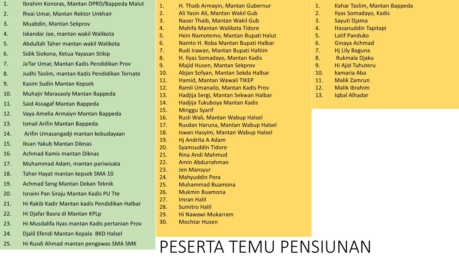 Mantan Kepala Bappeda Halmahera Barat Ismail Arifin menambahkan, agar tidak mubazir dan lebih akurat, sebaiknya tim 04 menghubungi lebih dulu para pensiunan untuk diminta kesediaannya hadir dalam pertemuan.