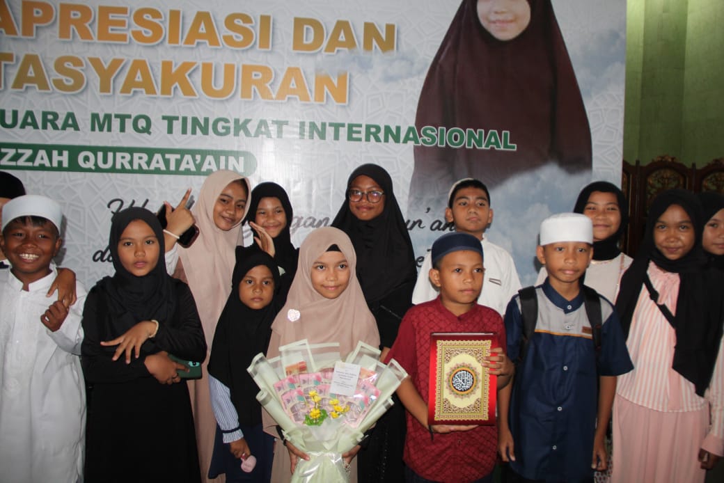 Ratusan jamaah berkumpul untuk memberikan apresiasi dan tasyakuran atas prestasi gemilang Izzah Qurrata’ain, qoriah cilik asal Ternate yang berhasil meraih juara pertama pada ajang Musabaqah Tilawatil Qur’an (MTQ) Internasional 2025 di Qatar.