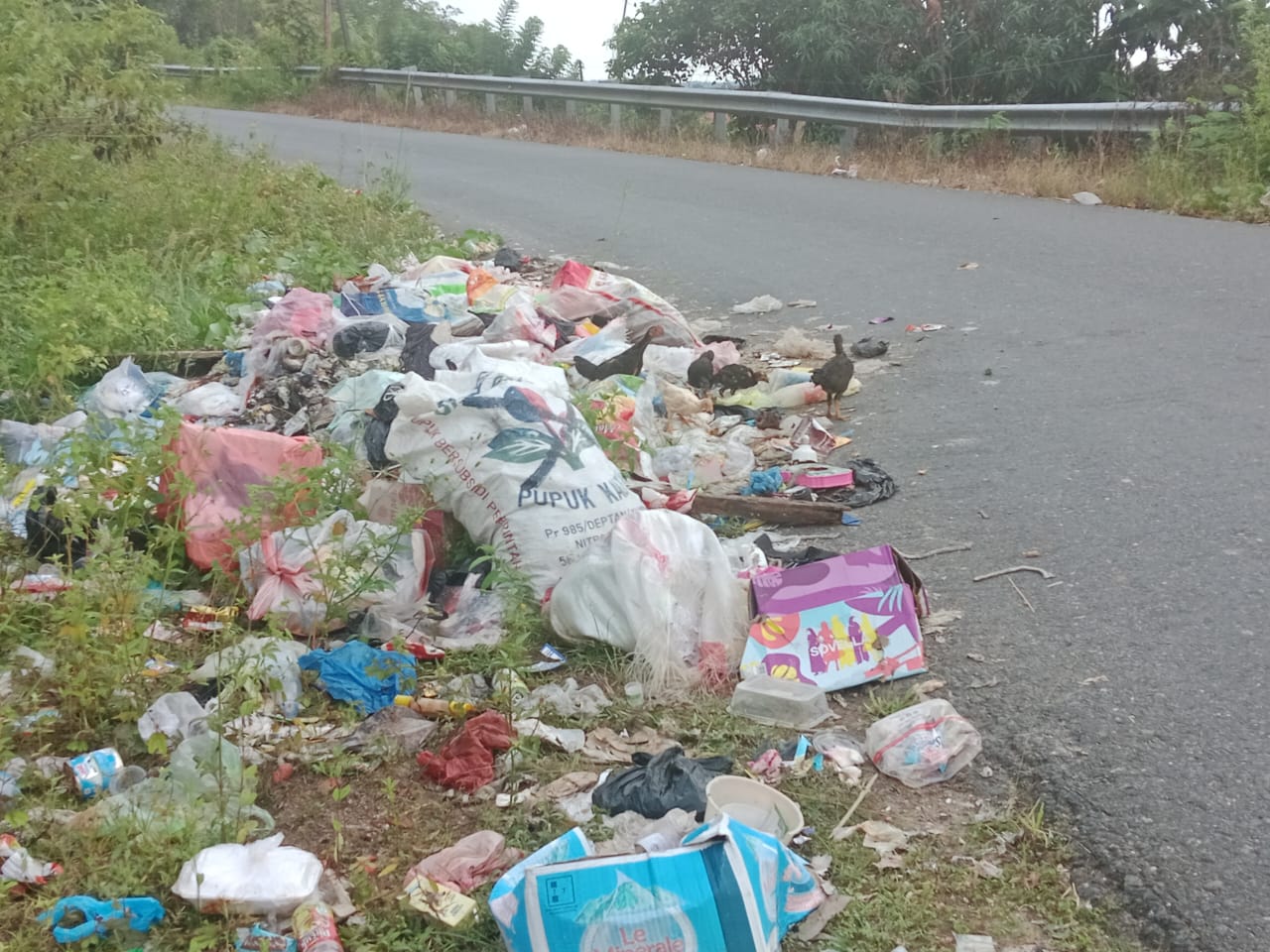 Tumpukan sampah plastik dan limbah rumah tangga terlihat menggunung di jalan menuju SPBU Premium, Desa Bobong, Kecamatan Taliabu Barat. Sampah yang berserakan hingga ke bahu jalan itu menimbulkan bau tak sedap, mengganggu warga sekitar serta pengendara yang melintas.