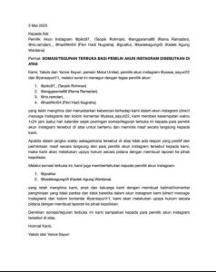 Melalui somasi tersebut, keempat pemilik akun diminta untuk menyampaikan permintaan maaf secara langsung dalam waktu 1×24 jam. Jika tidak ada respons positif atau itikad baik dari pihak terkait, Yakob dan Yance menegaskan akan melanjutkan proses secara hukum.