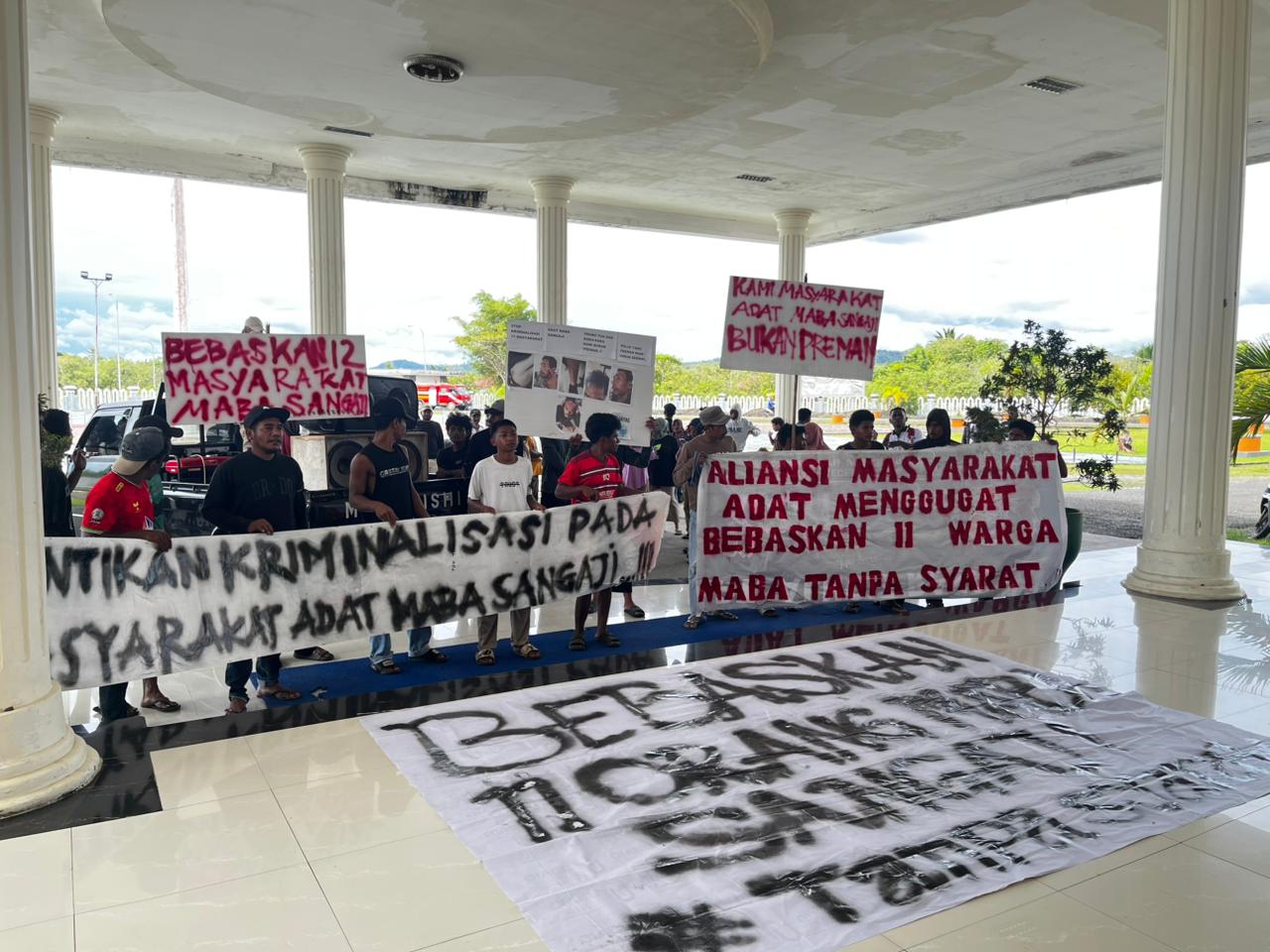 Ratusan massa yang tergabung dalam Aliansi Masyarakat Adat Maba Sangaji Menggugat menggelar demonstrasi di depan Kantor Bupati Halmahera Timur, pada Kamis, 22 Mei 2025. Aksi ini menuntut sikap Bupati Haltim Ubaid Yakub, atas penahanan 11 warga Maba Sangaji oleh Kepolisian Daerah Maluku Utara.