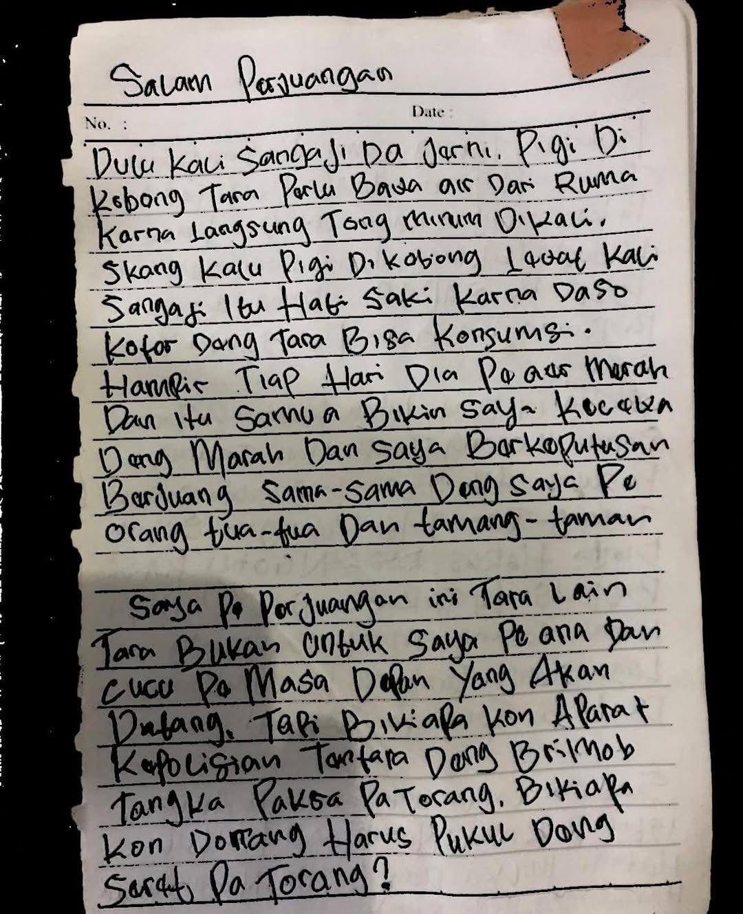 Saya pe perjuangan ini tara lain tara bukan untuk saya pe ana dan cucu pe masa depan yang akan datang. Tapi bikiapa kon aparat kepolisian, tentara deng brimob tangka paksa pa torang. Bikiapa kon dorang harus pukul deng seret pe torang?