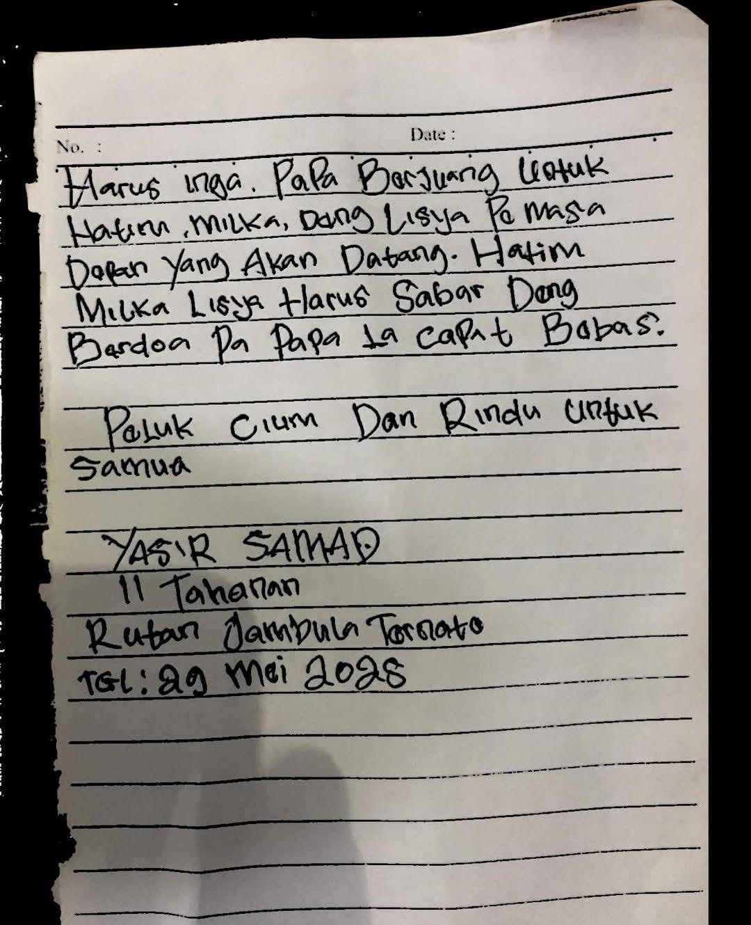 Salam cinta untuk saya pe anak-istri di rumah: Nurmianti Kailul, Hatim Milka deng Lisya, ngoni samua harus inga papa berjuang untuk Hatim, Milka deng Lisya pe masa depan yang akan datang. Hatim, Milka, Lisya harus sabar deng berdoa pa papa la capat bebas.