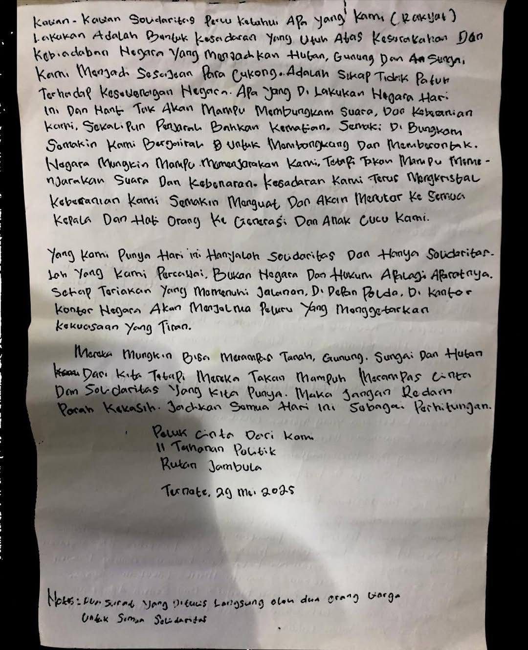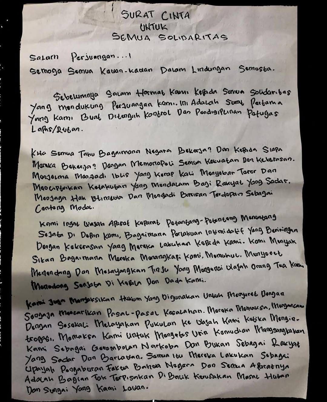 Notes: surat yang ditulis langsung oleh dua orang warga untuk semua solidaritas.