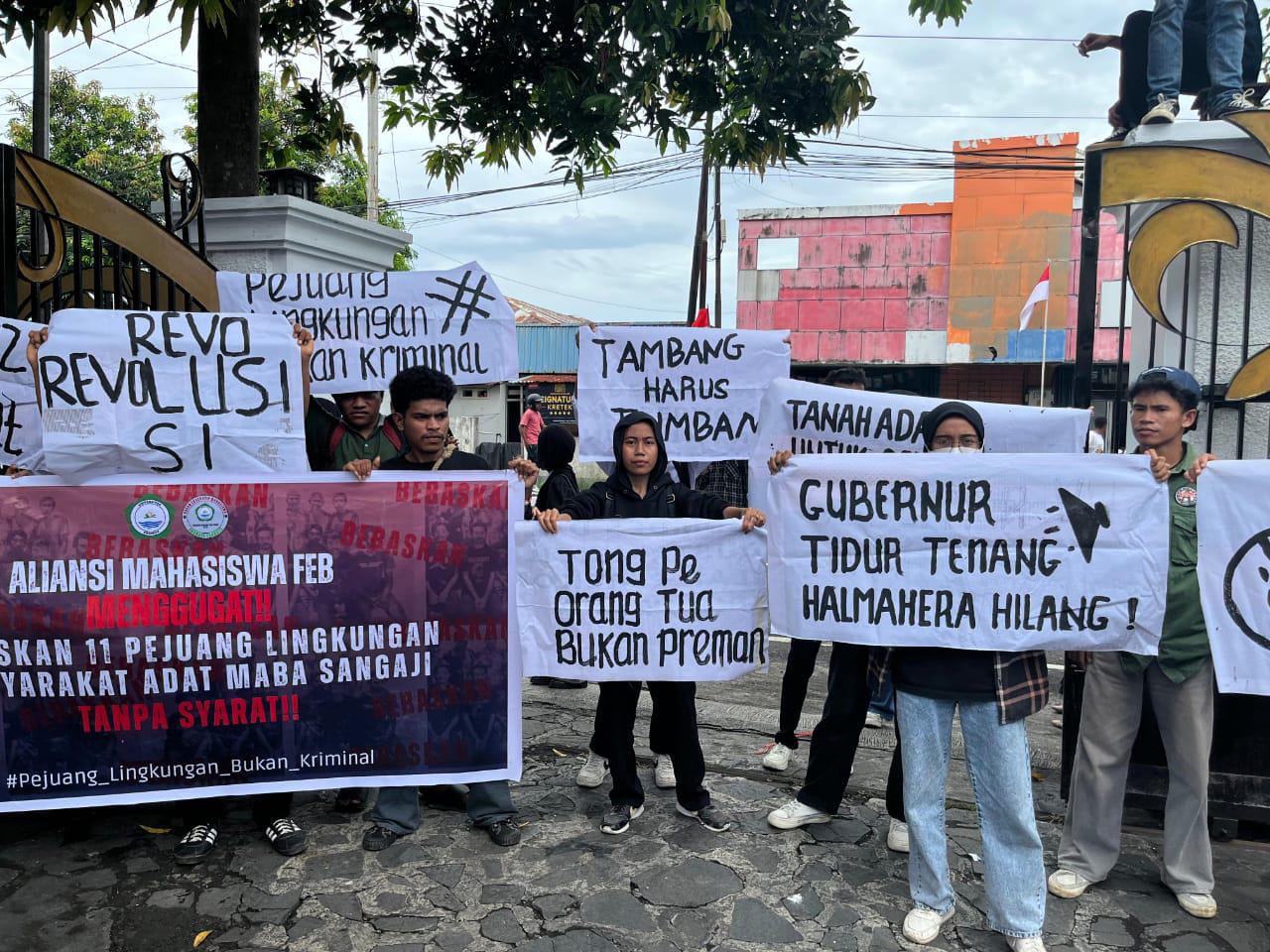 Puluhan mahasiswa yang tergabung dalam Aliansi Mahasiswa Fakultas Ekonomi dan Bisnis (FEB) Universitas Khairun Ternate menggeruduk kediaman Gubernur Maluku Utara, pada Kamis, 21 Agustus 2025. Mereka menuntut pemerintah daerah mengambil sikap politik untuk membebaskan sebelas masyarakat adat Maba Sangaji, Halmahera Timur, yang kini ditahan di Rutan Soasio.