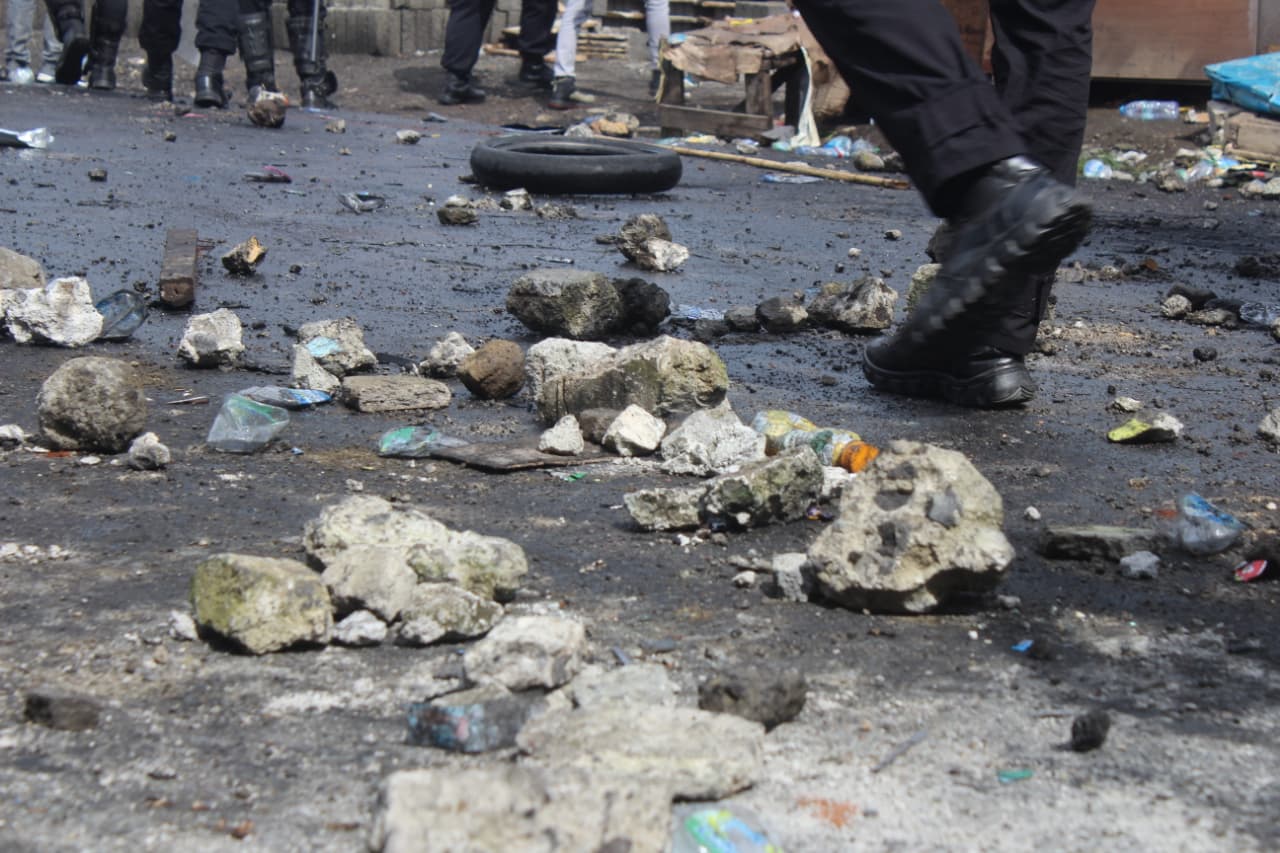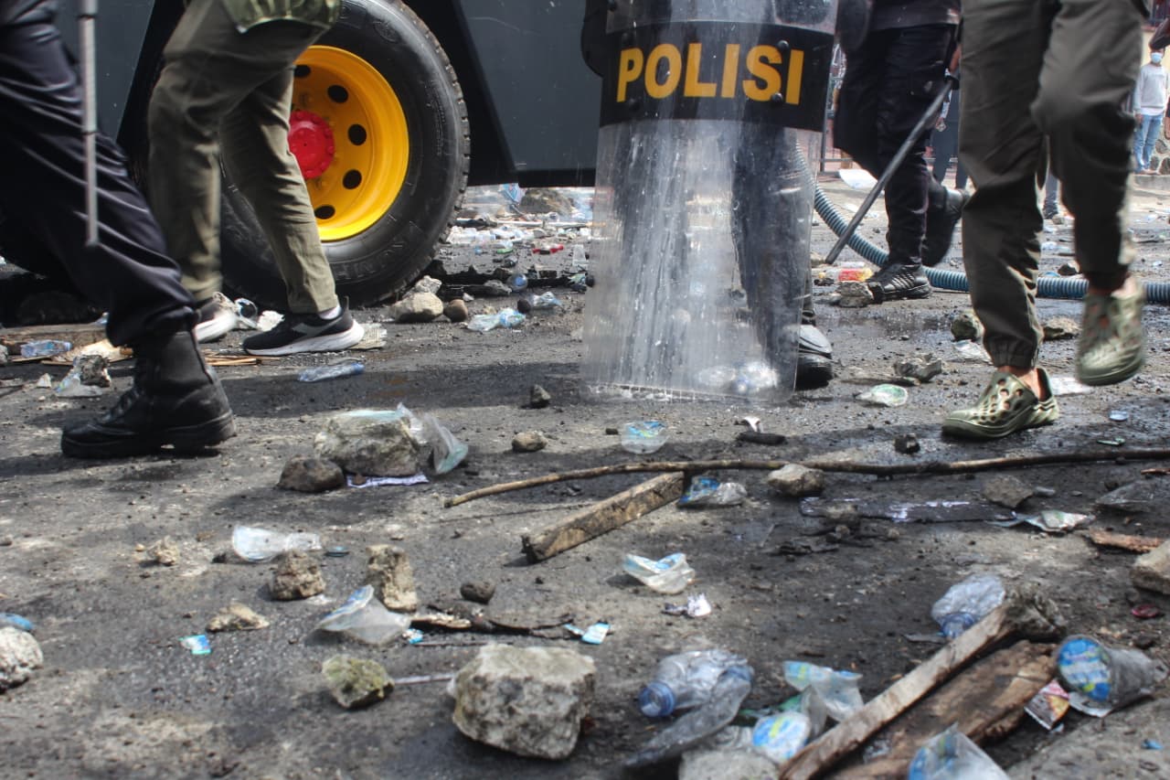 Batu bertebaran di sepanjang jalan depan kantor Dewan Perwakilan Rakyat Daerah (DPRD) Kota Ternate pasca demonstrasi bubarkan DPR, pada Senin, 1 September 2025. Diduga ada sekitar 26 massa aksi mahasiswa yang alami cedera serius usai ricuh dengan aparat kepolisian. Foto: Rajuan Jumat/Kadera.id.