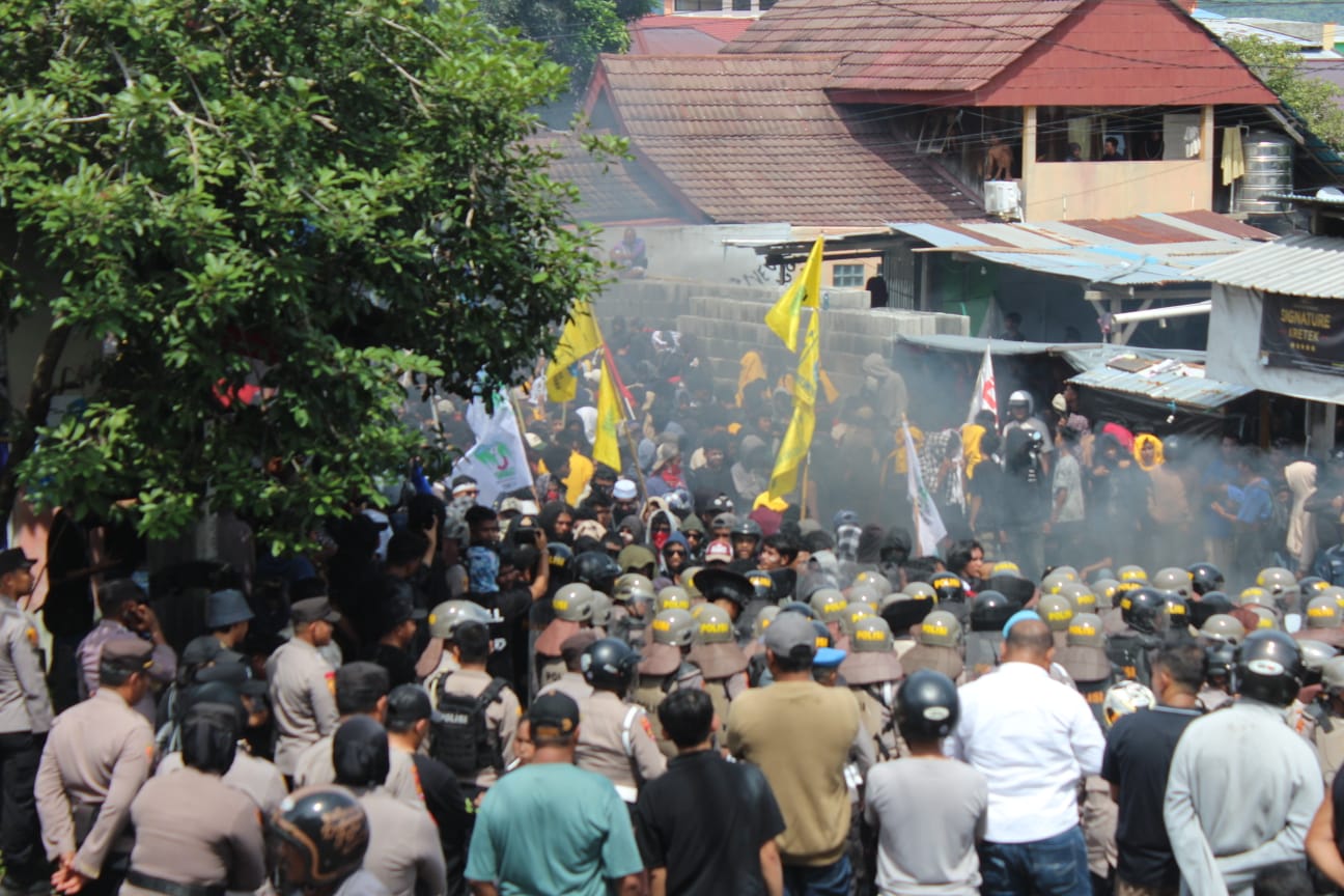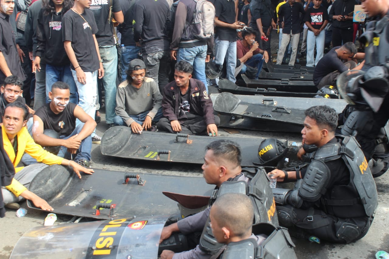 Saat polisi memukul mundur massa aksi demonstrasi bubarkan DPR yang coba menerobos duduki kantor Dewan Perwakilan Rakyat Daerah (DPRD) Kota Ternate, Maluku Utara, pada Senin, 1 September 2025. Foto: Rajuan Jumat/Kadera.idDetik-detik polisi memukul mundur massa aksi demonstrasi bubarkan DPR yang coba menerobos duduki kantor Dewan Perwakilan Rakyat Daerah (DPRD) Kota Ternate, Maluku Utara, pada Senin, 1 September 2025. Foto: Rajuan Jumat/Kadera.idSituasi menegangkan ketika polisi memukul mundur massa aksi demonstrasi bubarkan DPR yang coba menerobos duduki kantor Dewan Perwakilan Rakyat Daerah (DPRD) Kota Ternate, Maluku Utara, pada Senin, 1 September 2025. Foto: Rajuan Jumat/Kadera.idIntel aparat menangkapi massa aksi bubarkan DPR setelah ricuh di depan kantor Dewan Perwakilan Rakyat Daerah (DPRD) Kota Ternate, Maluku Utara, pada Senin, 1 September 2025. Foto: Rajuan Jumat/Kadera.idSerpihan batu di jalan utama dekat Tugu Makugawene hingga depan Kantor Dewan Perwakilan Rakyat Daerah (DPRD) Kota Ternate, Maluku Utara, pada Senin, 1 September 2025. Massa aksi berlarian dan ditangkapi polisi diduga setelah ricuh terjadi. Foto: Rajuan Jumat/Kadera.idAparat polisi secara brutal menangkap massa aksi mahasiswa yang melakukan demonstrasi bubarkan DPR di depan kantor Dewan Perwakilan Rakyat Daerah (DPRD) Kota Ternate, Maluku Utara, pada Senin, 1 September 2025. Foto: Rajuan Jumat/Kadera.idSerpihan batu di jalan utama dekat Tugu Makugawene hingga depan Kantor Dewan Perwakilan Rakyat Daerah (DPRD) Kota Ternate, Maluku Utara, pada Senin, 1 September 2025. Massa aksi berlarian dan ditangkapi polisi diduga setelah ricuh terjadi. Foto: Rajuan Jumat/Kadera.idKepalan tangan seorang anggota polisi saat ricuh dengan massa aksi demonstrasi bubarkan DPR di depan Kantor Dewan Perwakilan Rakyat Daerah (DPRD) Kota Ternate, Maluku Utara, pada Senin, 1 September 2025. Foto: Rajuan Jumat/Kadera.idMassa aksi demonstrasi bubarkan DPR duduk berdampingan dengan aparat pasca bentrok pertama di jalan utama pertigaan Tugu Makugawene dan Dewan Perwakilan Rakyat Daerah (DPRD) Kota Ternate, Maluku Utara, pada Senin, 1 September 2025. Foto: Rajuan Jumat/Kadera.id