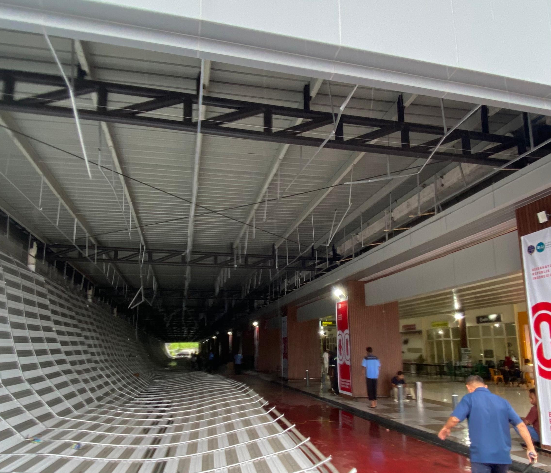 “Plafonnya runtuh serentak, dari ujung ke ujung jalur pejalan kaki di teras depan. Untungnya, tidak ada korban karena saat itu sudah tidak ada jadwal penerbangan,” ujarnya.