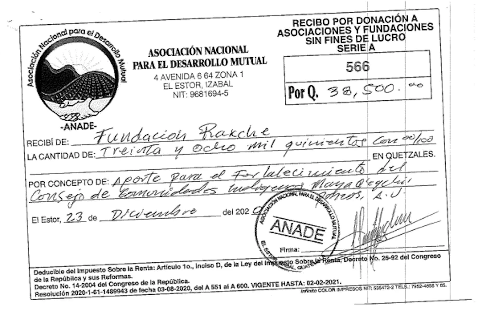 Antara Oktober 2020 hingga Januari 2021, setiap bulan, Raxche mengirimkan “dana penguatan” sebesar 38.500 Quetzales (mata uang Guatemala, atau sekitar Rp 82 juta lebih) ke rekening sebuah organisasi bernama National Association for Mutual Development (ANADE), atau Perhimpunan Maju Bersama. Raxche mengirim dana tersebut untuk diteruskan ke dua anggota dewan adat yang memihak perusahaan tambang.