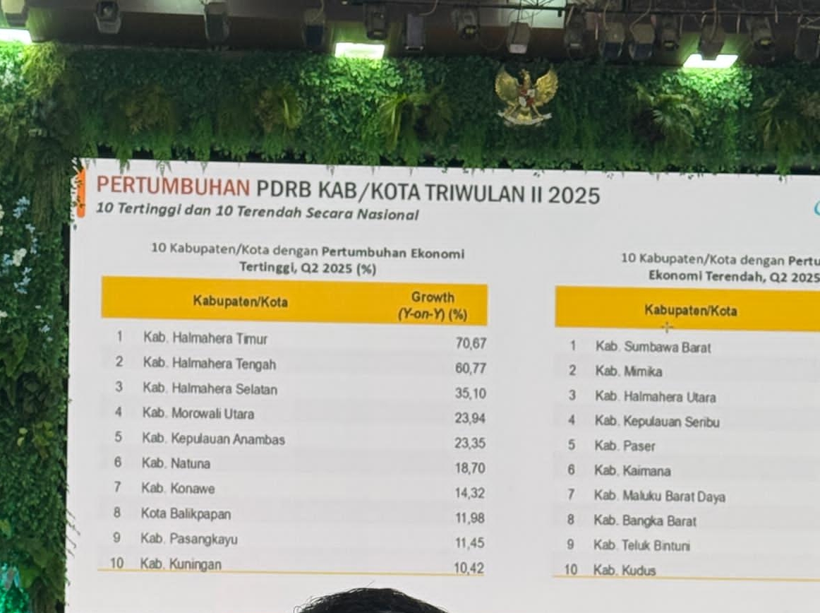 Kabupaten Halmahera Timur, Provinsi Maluku Utara, menempati peringkat pertama sebagai daerah dengan pertumbuhan ekonomi tertinggi di Indonesia, dengan capaian 70,67 persen.