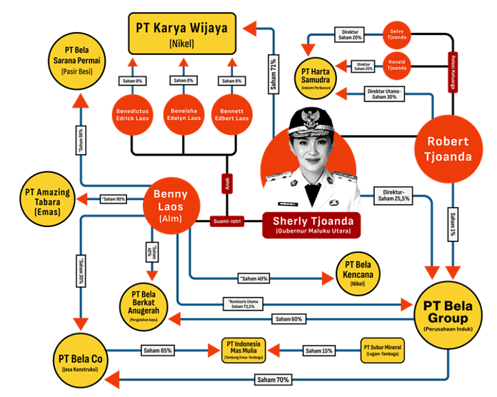 Jatam memetakan perusahaan yang terafiliasi dengan keluarga Sherly-Laos. Di antaranya PT Karya Wijaya yang menambang nikel di Pulau Gebe, Halmahera Tengah, PT Bela Sarana Permai menambang pasir besi di Wooi, Obi Timur, Halmahera Selatan, PT Amazing Tabara menambang emas, PT Indonesia Mas Mulia menambang emas, serta PT Bela Kencana menambang nikel, termasuk entitas terkait lain di bawah kelompok keluarga Laos-Tjoanda.