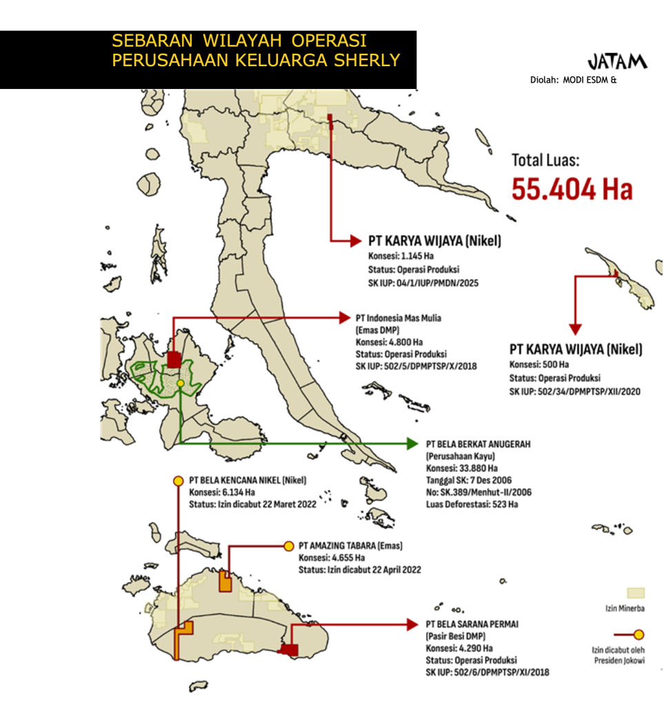 Jatam juga menemukan izin baru untuk PT Karya Wijaya–terutama di Halmahera baru terbit pada Januari 2025, saat Sherly mencalonkan diri sebagai gubernur Maluku Utara menggantikan mendiang suaminya. Jatam menilai proses izin perusahaan ini janggal.