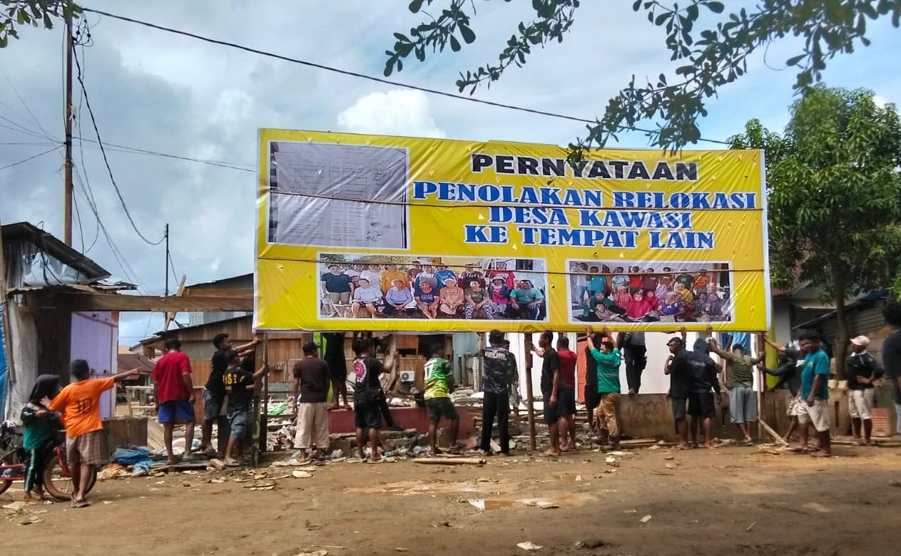 Warga memasang spanduk di sejumlah titik di dalam kampung. Sebuah spanduk besar berukuran 3 x 8 meter tertulis “Penolakan Relokasi Desa Kawasi ke Tempat Lain” berdiri tepat di jalan utama kampung berdampingan dengan rumah yang telah dibongkar. Warga mengartikan “Ecovillage” sebagai “tempat lain”.