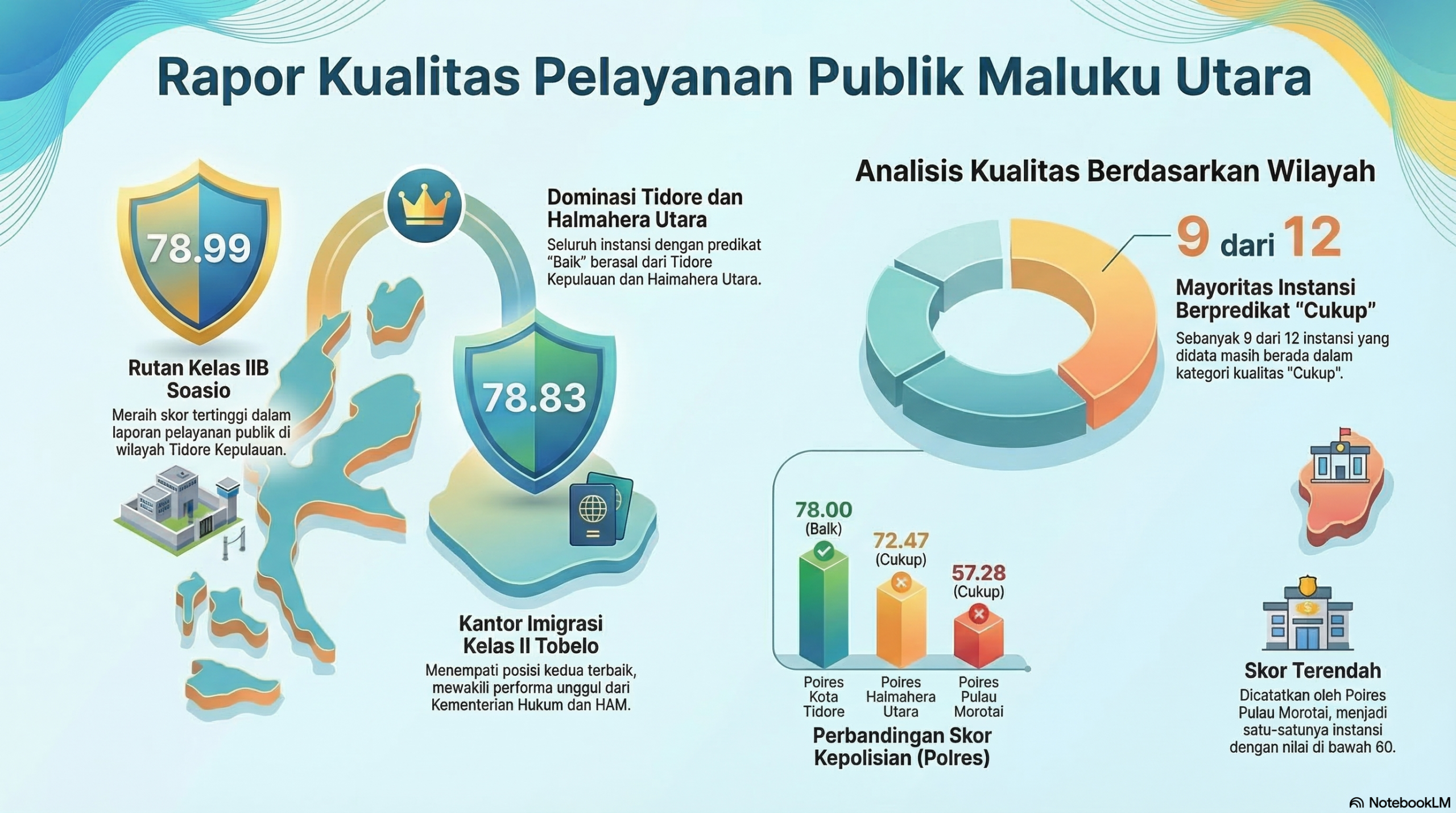 Sementara itu, sembilan instansi lainnya hanya memperoleh kategori “cukup” dalam pelayanan publik. Instansi tersebut antara lain Kepolisian Resor Halmahera Utara dengan nilai 72,47, Kantor Pertanahan Kota Tidore Kepulauan dengan nilai 71,17, dan Kantor Pertanahan Kabupaten Halmahera Utara dengan nilai 70,17.