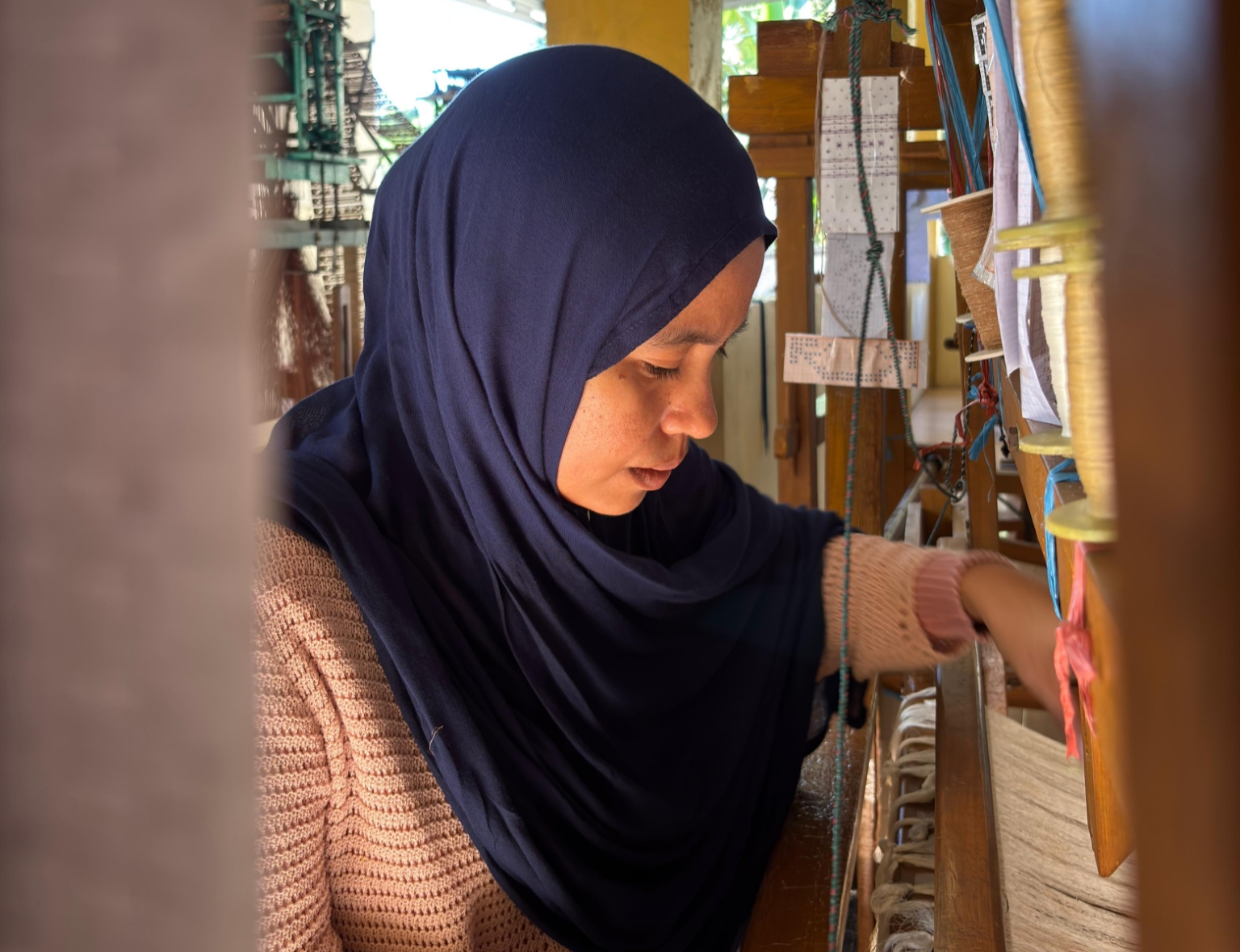 Di dalam ruangan yang tenang, suara alat tenun berpadu dengan benang yang melingkar di setiap sudut. Ritmenya konstan, dari pagi hingga sore, menjadi simbol ketekunan, harapan, dan perjalanan panjang seorang perempuan muda: Sri Wahdania Abukasim Sangadji, yang akrab disapa Wani.
